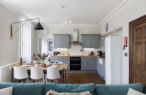 Open plan layout with induction hob, electric under counter oven, dishwasher, fridge/freezer, toaster, kettle, Lavazza coffee machine, milk frother and dining table with seating for six