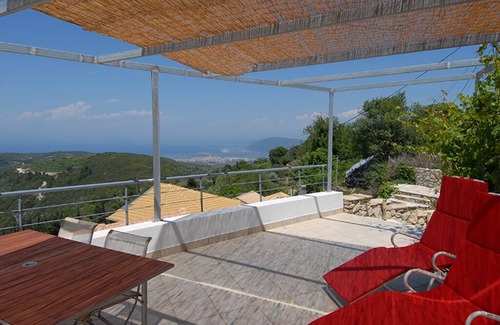 The holiday home, stylishly renovated stone house with a fantastic sea view. The stone house was restored in cooperation with a Swiss architect with its modern construction and is located on the edge of the village of Kavalos on the Ionic Island Lefkas / Lefkada. It offers all comforts and during the summer, it is a relaxing escape from a hot day at the beach and on cooler days, it is a cosy place with a lot of atmosphere. The view from the terrace is overpowering. You look out onto olive groves and vineyards, the city of Lefkas, the Ionic Sea and beyond to the impressive Epiros mountains. You can go swimming by the nearby dream beaches or you can eat well and drink in a tavern by the sea, hike, go cycling, talk with the locals in the village Kafenion or just enjoy the tranquillity on the terrace. If you are going to rent a car, take a smaller one to get easily to the house through the narrow village streets. A German friend in the city will welcome you and is there for any questions you may have. In 2006, our holiday home was selected as the super holiday home from Pro7 Avenzio. DVD on request.
