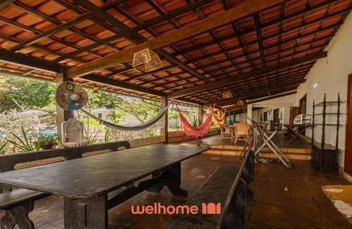 A área externa conta com piscina, espreguiçadeiras, churrasqueira, varanda com área gourmet, quintal, pátio, rede, assentos ao ar livre, cozinha externa e chuveiro externo ideal para quem volta da praia. Há ainda estacionamento descoberto com capacidade para até 10 carros.