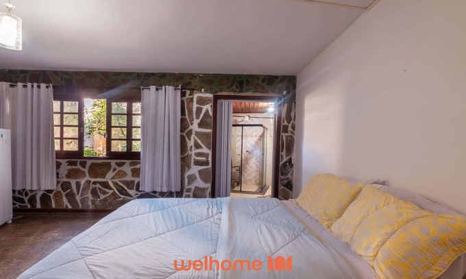 A suíte acomoda até 3 hóspedes, sendo equipada com uma cama de casal e uma cama de solteiro. O ambiente conta com ar-condicionado, armário, TV, luminária, roupa de cama, travesseiros e cobertores. É um espaço acolhedor e funcional, ideal para casais ou pequenos grupos que desejam conforto e praticidade.