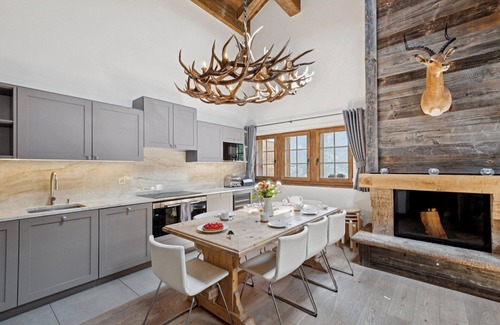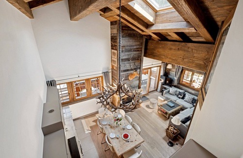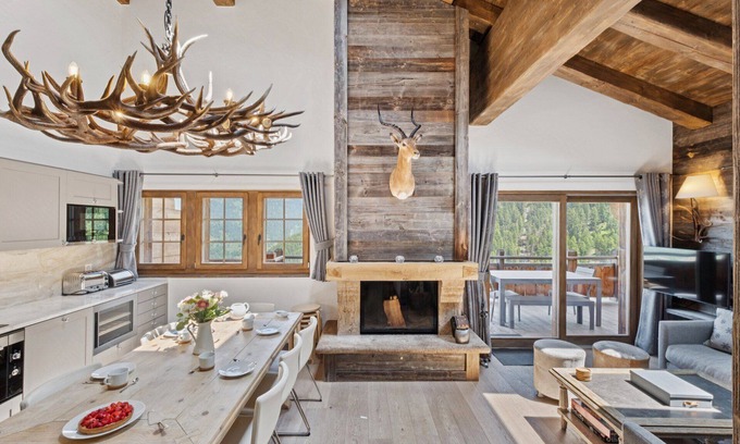 Chalet Skyfall by Mrs Miggins has been inspired by traditional alpine culture and a modern, bespoke design, perfect your stay in one of the most beautiful villages in the Alps: Grimentz!Skyfall by Mrs Miggins is a luxurious duplex apartment located very close to the slopes and ski lifts. The apartment has been beautifully finished with old wood, a large stone fireplace and a beautiful antler chandelier on the dining table.Relax in the kitchen and living room or take a walk outside on the large balcony which offers exceptional views of the village, the mountain and the valley.The apartment offers four bedrooms that can accommodate up to 10 people comfortably.The master bedroom has a double bed and an en-suite bathroom with bathtub and en-suite shower. The second large bathroom is shared by a double bedroom and a bedroom with four bunk beds.Stairs lead up to the upper floor to access a fourth bedroom with twin beds and a bathroom. Guests also have free access to the building's private gym, sauna and table tennis room. There is high-speed internet, cable TV, a separate private laundry room, and a dedicated parking space in the garage below.High quality bed linen and towels provided, free high-speed fibre optic internet, cable TV, DVD, a separate private laundry room, ski boot room and two dedicated garage spaces.** A security deposit request will be sent to you by email prior to your arrival date.Payment of this deposit is mandatory before you enter the property.The amount of the guarantee depends on the accommodation booked. ** --