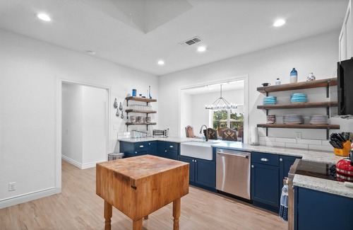 The Social House is the newest Addition to our property. It houses a full catered kitchen that can be available upon request. There are also two comfy seating areas, a game table with several board games, a large Smart TV, Ice Machine, Mini Fridge, and two bathrooms. The large sliding doors make it easy for your family and friends to flow inside or outside while dining. The covered patio is an extension to the pool area. There is also a gas barbecue grill and a fire pit for relaxing around and star gazing the night away. The Social House is available for catering by our in-house chef.