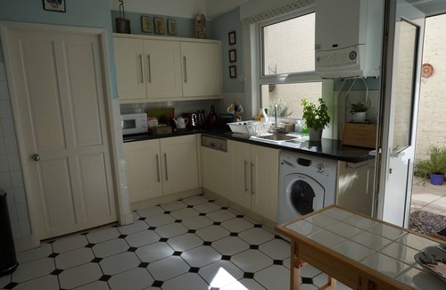This 2 bedroom ground floor apartment set in a Victorian house consists of a large living room/ dinning room with a original victorian fire place. The first bedroom is a double and is on the ground floor, the second is a large twin bedroom on the lower ground floor. The bathroom and toilet has been recently renovated and is now a contemporary wet room. The kitchen is well equipped with dishwasher, washing machine, fridge- freezer, microwave, ceramic hob,oven etc. This holiday apartment also has its own private patio area full of flowers, with garden furniture ideal for relaxing. It is also very safe for children.
