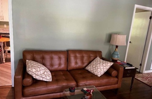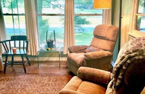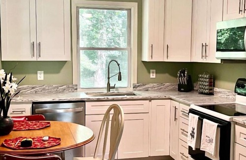 Brand new beautiful kitchen with granite counters, new cabinets and new appliances Small but efficient bathroom with new walk-in shower. Living room has 3 large windows bringing in natural light . New leather sofa and large screen TV. New plumbing, new heating/cooling system, hardwood floors. House is approximately 1000 square feet plus basement with new washer and dryer. All on one level ,except breezeway, which is fully conditioned. Fully furnished. Large parklike yard. Bridge over stream. Plenty of parking.