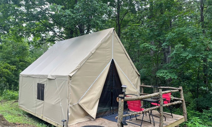 Get ready to relax in this superb 1-bedroom off-grid glamping tent in Saint Johnsbury. Comfortably sleeps 2 guests with a king bed includes all linens, your own charcoal grill, firepit and beautiful views. A superb feature is you are able to park at your site and walk to the Basecamp lodge which serves as guests common area includes two bathrooms, full kitchen access, TV, WIFI, Desk Workspace, refrigerator to store your food. We also include a gift shop where we sell custom T-shirts, Custom made cutting boards, fresh maple syrup, Ice, Firewood, Firestarter. The common lounge is located adjacent to Sugar Brook tent allowing your full privacy with the convenience of close proximity for restrooms etc. This is a must for anyone looking to experience hiking our many trails and really immersing in all glamping has to offer so come unwind in this marvelous retreat and experience the magic of Saint Johnsbury. Our guide book will share many interesting locations to visit during your stay.