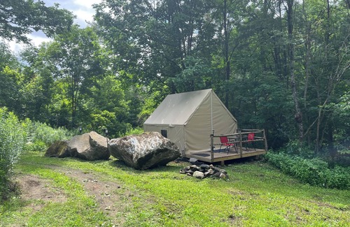Get ready to relax in this superb 1-bedroom off-grid glamping tent in Saint Johnsbury. Comfortably sleeps 2 guests with a king bed includes all linens, your own charcoal grill, firepit and beautiful views. A superb feature is you are able to park at your site and walk to the Basecamp lodge which serves as guests common area includes two bathrooms, full kitchen access, TV, WIFI, Desk Workspace, refrigerator to store your food. We also include a gift shop where we sell custom T-shirts, Custom made cutting boards, fresh maple syrup, Ice, Firewood, Firestarter. The common lounge is located adjacent to Sugar Brook tent allowing your full privacy with the convenience of close proximity for restrooms etc. This is a must for anyone looking to experience hiking our many trails and really immersing in all glamping has to offer so come unwind in this marvelous retreat and experience the magic of Saint Johnsbury. Our guide book will share many interesting locations to visit during your stay.