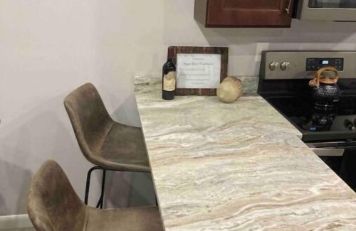 The living room has a 55'' Samsung TV also with Roku. There is also a wall mounted electric fireplace for ambiance that you can use with or without heat. The hospitality style sleeper sofa easily unfolds to a Queen Plus size gel mattress.