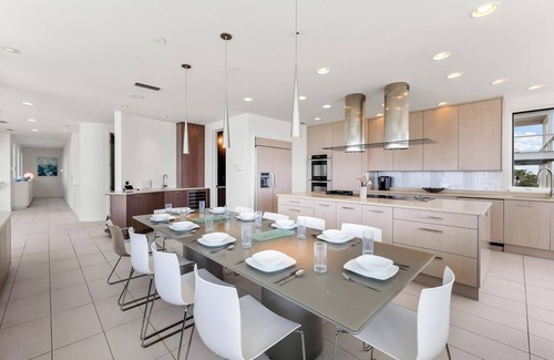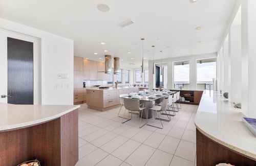 - Open-concept living, dining, and kitchen area with 2-story ceilings and floor-to-ceiling windows overlooking the Gulf.