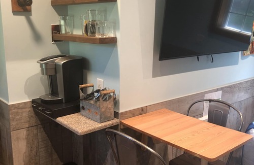 The surprisingly well equipped kitchen comes with a refrigerator, one induction burner, convection oven, Keurig K-cup coffee maker and dishwasher. A full assortment of cooking utensils are provided. You will be surprised how much space you have to prepare a meal if you desire! There is also an outdoor propane BBQ and Fire Pit for grilling and smoring!
