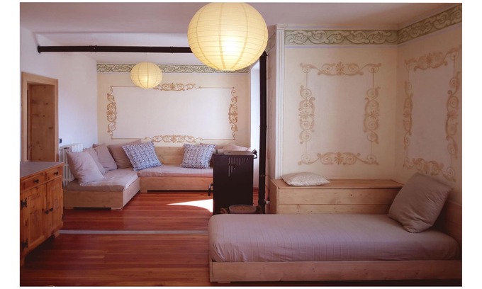 Suggestive frescoed apartment with two bedrooms and hall overlooking the mountains of Bormio. Located near the ancient Fornaci di Premadio a few steps from the park of Bagni Vecchi di Bormio and a few minutes by car from the ski slopes. Ideal accommodation for 4 people, extendable up to six beds if necessary.