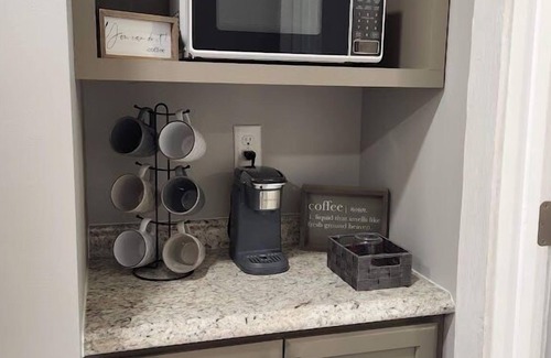 One step outside the bedroom is a coffee bar sure to make waking up a pleasure.
