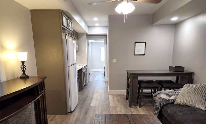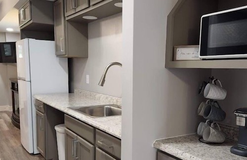 The large kitchenette is equipped with a microwave, fridge, plates, glasses, silverware, salt, pepper, toaster, etc, and a table for four if you'd like to eat in the privacy of your apartment. You'll also love the covered porch just outside the front door of your apartment as well as the deck at the rear of the building. Yet, if you're looking to venture out, you'll be mere moments from restaurants, shopping, groceries, gas, ice, and nightlife all within a 2-mile radius of your location.