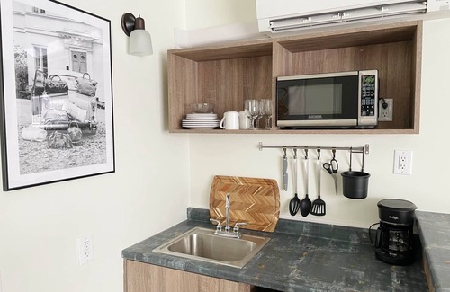 This eclectic and cozy suite features a living area with a flat-screen TV, nap-worthy day bed and picture window that fills the space with natural light. A kitchen features a wet bar, small refrigerator, microwave, sink, and most importantly a coffee maker.