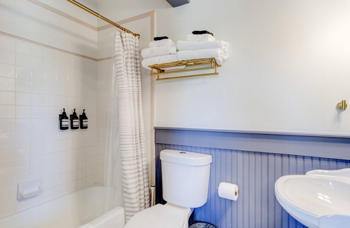 Private suite 11, tucked in the back corner on the upper level, is a delightful retreat. Guests enjoy the mountain views and abundant natural light. A distracted bricklayer from 130 years ago has made his mark on this room: one side of the bathroom is one brick higher than the other! When the error was discovered during the 1990s restoration, the error was kept intact, preserving the human touch on this special building.