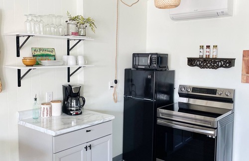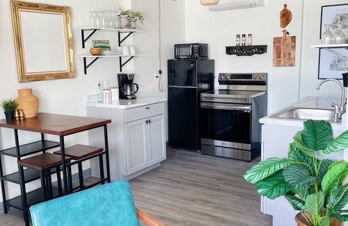Blending relaxation and sophistication to create a little oasis! Open floor plan, 1 large bedroom with work space, central heat and air, 2 full bathrooms and flat-screen TVs for streaming your favorite Netflix shows! A nap-worthy day bed and picture window that fills the space with natural light. The kitchen features brand new appliances - oven, refrigerator, toaster, microwave, sink, and most importantly a fully stocked coffee bar.