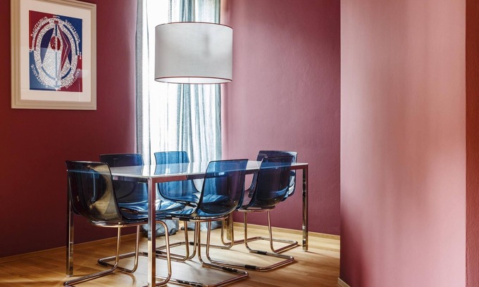 Suite Barbo is characterized by an intense and pasty aubergine shade matched with a geometrical ton sur ton wallpaper. It is finely decorated with unique design pieces, such as the small 1960s oak sideboard at the entrance. The Suite includes a living area, dining area, kitchen, master bedroom, twin bedroom, and bathroom.