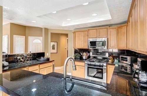 Tucked inside a gated community, this two-story home features a direct-enry 2-car garage, modern decor, and all the comforts of home. The spacious living room welcomes you with a comfy sofa, cozy side chair, and a large smart-TV - perfect for winding down after a long day. The adjacent dining area opens to a private patio with BBQ, and flows on the other size into a fully stocked kitchen. For a morning coffee to a special-occasion meal, you'll have what you need.