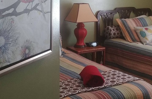 The suite welcomes you with a small sitting area and separate desk. The suite features two bedrooms; the master overlooks historic downtown and has a queen-size pillowtop bed, sitting area with 42' flatscreen TV with DVD player. Two twin beds are located in the second bedroom along with a flatscreen TV and DVD player. Both bedrooms include a small armoire and luggage rack. The kitchenette offers a small fridge, microwave, toaster and coffee maker along with a small dining table. The bathroom is equipped with a shower and complimentary soaps. Complimentary off-street parking, WIFI and Roku with complimentary Sling TV are also included.