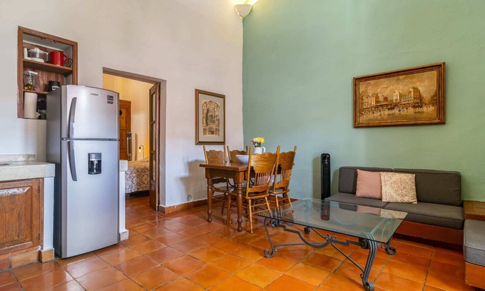 We welcome you to Queretaro with this charming Spanish style apartment, located in the heart of the city. Perfect for two, this cozy space offers you a complete experience with kitchen, private bathroom and dining room. Enjoy the tranquility and elegant design, very close to the most interesting places. With a king size bed and street views, you'll feel right at home!