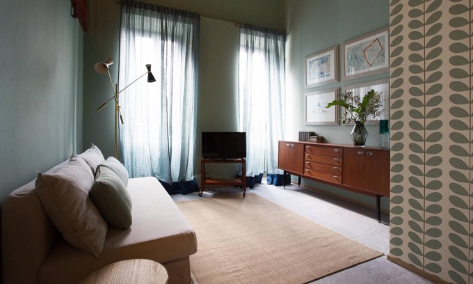 Suite Salmerino is characterized by the leaf wallpaper in shades of teal. It is finely decorated with unique design pieces, like the floor lamp by Giò Ponti in the living area. The Suite develops on two floors and includes a wide private dehor, living area, dining area, kitchen, master bedroom, single bedroom, and bathroom.