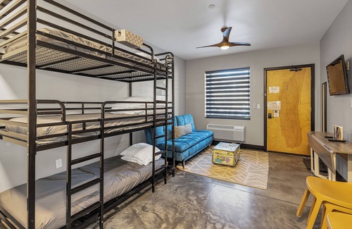 This pet-friendly first-floor suite is perfect for couples, friends, or family sleepovers. It has a private queen bedroom, full bathroom, kitchenette, and sleeps 3, plus extra space with triple bunks. Enjoy the hotel’s community space with a pool, ping pong, games, trains, and LEGO stations—fun for the whole family!