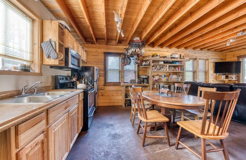 The two bedroom, one bath main cabin is idyllic with a rustic yet elegant feel both inside and out. The open floor plan downstairs provides a relaxing space for family and friends to cook and socialize.