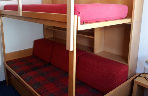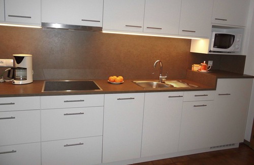 Three-room app. on two floors for 3 adults or 2 adults + 2 children from 5 years to max. 15 years). Kitchen with 4 induction plates, refrigerator, kettle, microwave, coffee machine, dishwasher, toaster / living-dining room with satellite TV, elevated floor a double bed, south-facing terrace, upper floor: bedroom with single or bunk bed, satellite TV, bathroom.