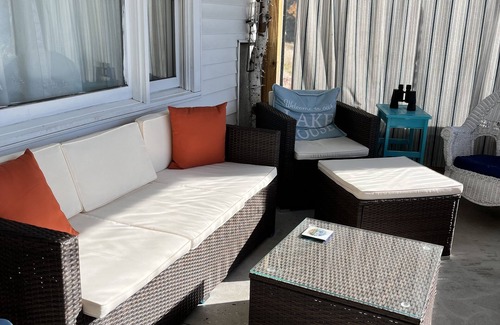 There is a sun porch with a twin size bed that has a twin size trundle under for more sleeping. The other end of the sun porch has a cozy sitting area with two recliners and rocking chair. The sun porch leads to a sun deck. A great place to enjoy your morning coffee. The living room contains a couch, tv with streaming and two recliners. The dining area has a large table to hold 8 people. There is also a bathroom with walk in shower and a laundry room with a stack washer/dryer for your use.