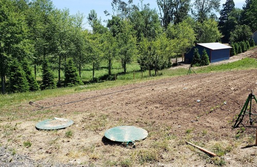 We have a nice camper behind our house in a peaceful country setting. It has heat and air conditioning to keep you comfortable! The master bed is curtained off next to small full bathroom. Couch and table each turn into twin bed, big enough for one adult or two children. There is full kitchen including double sink, dishes, fridge with small freezer, stove with oven, and microwave.. There is outdoor space to enjoy as well, with option for table, seating, hammock, and fire pit until the fire ban starts about July 1st.