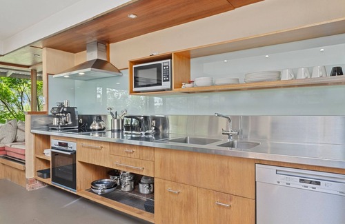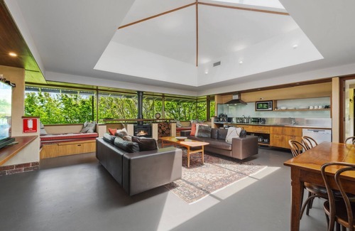 The home features a sun-filled atrium, which is the highlight of the large living area. The living area boasts stunning views, comfortable lounges, and a gourmet kitchen with a wood fire and Breville expresso coffee machine. The bedrooms, located at opposite ends of the home, feature king-sized double beds, and have their own private bathrooms.