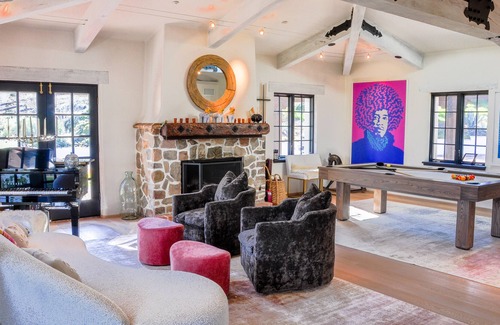 The main residence includes 3 bedrooms, each with a private bathroom and flat screen TV, 3 fireplaces, large formal dining, gourmet kitchen, wine cellar, great room and kid’s retreat. Directly adjacent is the charming Casitas, or guest house, with two additional bedrooms, a large bathroom, living room, fireplace and a stunning eat-in kitchen. Additionally, “the Loft” is a spacious retreat including a king bed and bathroom, fireplace, flat screen TV and large lounging area.