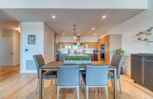 Ultra modern and luxurious, this new condo perched atop The Old Mill just opened as a vacation rental. Beautiful modern furniture along with luxury amenities, such as heated tile floors in the master bedroom, king size beds, and a garage for parking your car. Located close to the shops, restaurants and theaters in The Old Mill District as well as The Box District and Market of Choice. All are within walking distance. Sounds from the Les Schwab Amphitheater fill summer nights as you watch the sun set over the Cascades. The view will take your breath away! Beds and linens chosen for a good night sleep. The kitchen is well stocked for preparing meals in house. Parking is available in the garage where you will also find stand up paddle boards, river tubes, and the makings for a picnic in the park. This is truly a unique property in Bend.