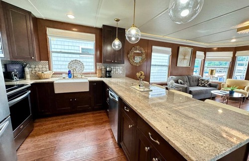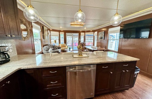 Enjoy beautiful Lake Cumberland with a stay right on the water in the Summersun houseboat at Lee’s Ford Marina. Enjoy all the comforts of home in this huge 4 bed 2 bath houseboat! Complete with 2 king beds and 3 queen beds, a fully stocked kitchen, washer and dryer, and massive covered upper deck, front patio and back deck! Hang out at the dock or find a nice cove on Lake Cumberland! There is plenty of room for all of your friends and family!