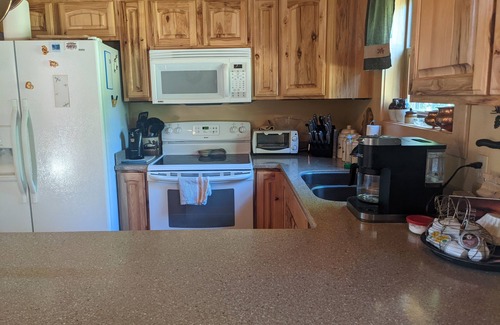 The inside of the house includes an open living room and kitchen. There is an open loft perfect for kids play time or a quiet get away. The kitchen is fully furnished with dishes, pots, pans, silverware etc and a dual Keurig/coffee maker. Internet and Roku included for your convenience.
