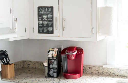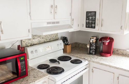 The well-appointed kitchen boasts a fridge, oven, toaster, microwave, and a Keurig Brewer with an initial supply of assorted K-Cups to fuel your getaway.