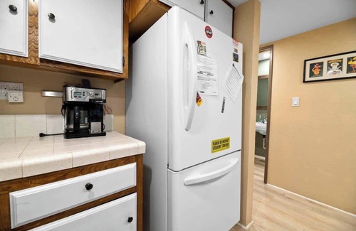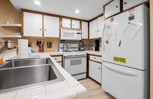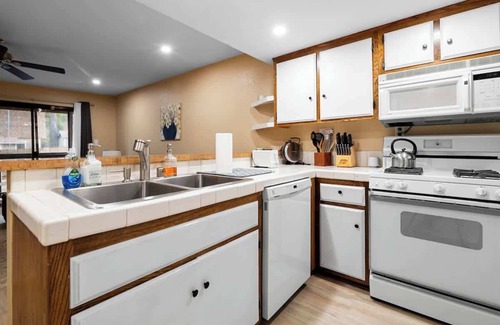 Kitchen- Open concept with visibility into dining and living area. Bar seating for 2. Full-sized fridge, gas stove, and dishwasher to help you create wonderful meals. If you prefer take-out no worries! Fully stocked with all utensils, dishware, and cookware. A starter pack of paper towels, and trash bags are provided. Along with dish soap, new sponge, coffee grounds, and sugar.