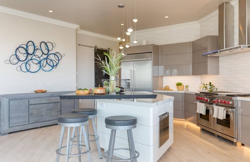 Your culinary adventures are elevated in the fully equipped chef's kitchen, where every detail has been meticulously curated. With barstool seating at the island counter and a suite of top-tier appliances, including an oversized range and double ovens, there's room for multiple chefs. Enjoy your creations in style, indoors or at the shaded al fresco dining area overlooking the infinity pool and your private vineyard.