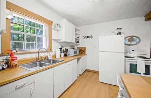 Fully equipped with a full-sized refrigerator, oven, stove, microwave, toaster, and all the basic kitchen essentials; Pots/Pans/Plates/Cups/Utensils. A coffee station is provided along with Keurig and Coffee Pot (pods, coffee, creamer, & sugar provided).