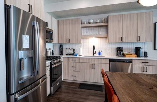 This modern retreat has all the comforts of home. The living area boasts an electric fireplace, where you can choose from a range of flame and ember bed colors to suit your mood while staying warm with its built-in heater. Control all these features effortlessly with the convenient skinny remote located on the coffee table. Whip up your favorite meals in the fully equipped kitchen featuring a gas stove, and gather around the dining table for a family dinner or game night.