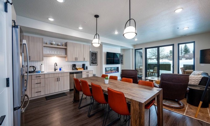 Elevate your stay with our fully-equipped kitchen, with a dining area that comfortably seats eight with spectacular views of the Wasatch Mountains and light streaming in from the large windows. The living room provides a fun setting for a movie or to relax with a good book in front of the fireplace. Or step outside on the patio and enjoy the majestic view of the mountains.