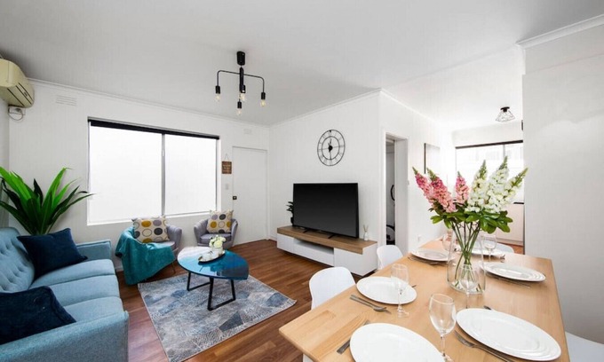 Stay in style at this modern 2-bedroom apartment in the heart of Albert Park, Melbourne. This stylish and cozy accommodation is perfect for couples, families, or small groups. Featuring bright and spacious open-plan living and dining, fully equipped kitchen, comfortable furnishings, and reverse cycle air conditioning. Both bedrooms have BIRs and comfortable Queen beds, while the modern bathroom has all essentials.