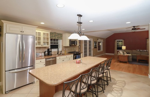 Inside we have plenty of space and hand selected furnishings to accommodate families/ groups of up to 14. he space After renting vacation homes across New England for over 10 years, we decided to create what we thought would be the perfect four season getaway for our family as well as guests who want to rent it. We spent time curating the most important offerings like brand new memory foam mattresses, down comforters with duvet covers and high quality sheets and towels, comfortable lounging furniture, central AC, as well as modern entertainment options and a fully stocked kitchen for up to 14 people.