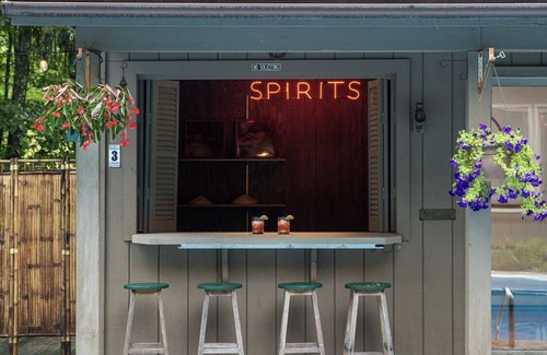 Outside, hike or simply watch wildlife in our 50 acres of secluded forest and grounds. If it's too chilly to work out outside, hop on the exercise bike or tune in to a virtual workout class in our sunny attached yoga studio. Take a dip in our big saltwater pool (open seasonally and unheated — please inquire before booking!), surrounded by a ‘70s-themed cabana bar, a Finnish steam sauna and 7-person hot tub (both open year-round), an outdoor shower, two grills, and wooden deck with multiple comfortable seating areas and an 8-person teak dining table. Watch the sunset at the gazebo next to our private pond, or on cold winter nights, snuggle up with some cider and watch the stars while sitting in Adirondack chairs around our fire pit.