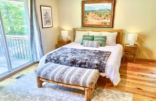 The cabin feels secluded, rustic, and so cozy. Our Master Bedroom has been tastefully curated with a king size bed, 55” smart tv, wicker lounge chair, extra blankets and pillows, a telescope for you to take out on the deck, and more! A second bedroom has a plush queen bed, and a third bedroom has 2 comfortable twin beds.