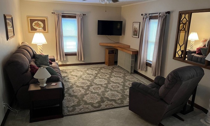 quick walk to knit and gift shop, grocery store, 3 restaurants and bakery. Short distance to all ski hills, ATV & snowmobile trails one block away..free trailer parking across street. Petal bikes provided during summer months to ride the many bike trails..beautiful water falls...Might see the Northern Lights on a clear night...spacious with full kitchen, coffee, tea, virgin oil and spices.. 43" tv in bedroom and 55" tv in livingroom with free wi-fi free laundry. Garage parking, keyless entry with code.