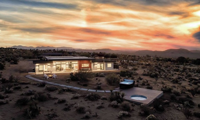 Best-rates for the Joshua Tree house starts from $535 per night with includes Parking, Pool, Private Pool, Balcony/Terrace, Child Friendly, Air Conditioner, Pet Friendly, Hot Tub, Security/Safety, Sports/Activities, Bedding/Linens, Fireplace/Heating, Guest Services, Barbecue/Outdoor Cooking, Internet, Kitchen, TV, Wellness Facilities, Entertainment, Laundry with all other amenities. Perfect for Weddings is committed to ensuring every guest experiences a comfortable and extraordinary stay, whether planning a romantic getaway, a honeymoon, a pet-friendly stay, or celebrating with the entire wedding party.