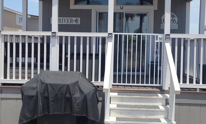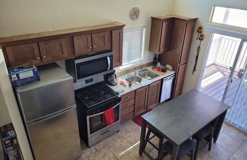 Discover the unique charm of Tiny Home @ AZO – a personal retreat, distinct from typical resorts. Unwind in the master bedroom with a queen-size bed and smart TV, complete with included WiFi. The loft boasts a Queen and Cal King bed, but beware of the low ceiling. The fully equipped kitchen, smart TV in the living room, and convertible couch offer comfort and convenience. Enjoy natural light on the porch with picturesque views. The clubhouse, showers, and laundry room are conveniently opposite the cottage, while the pool and dock are within walking distance. Embrace summer days on the river slide or explore nearby trails with your Razors or toys. Accommodating up to 6 people, the home is steps away from the Colorado River and a short drive to Quartzsite. For larger groups, AZO's website features additional homes and cabins. Note: Beds have sheets in the summer; blankets and sheets are provided in other seasons. Rest assured, the exterior is monitored with video cameras for security.