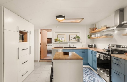 Families will appreciate the dedicated playroom stocked with toys, while cooks will enjoy the updated kitchen with open wood shelving, ample storage, and all the essentials. Whether you’re dining al fresco, curled up on the leather couch for a movie night, or savoring the garden views from the porch, this home offers a peaceful rhythm in the heart of downtown.