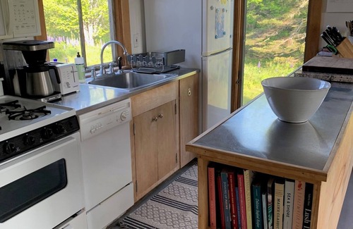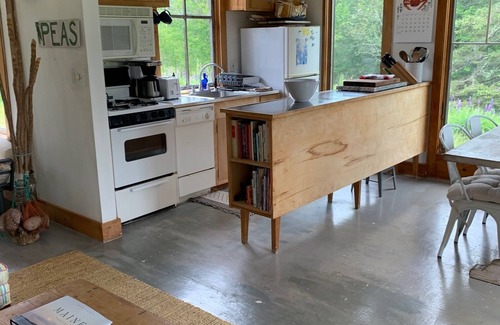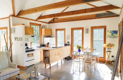 The cottage is light and airy- 15' ceilings and surrounding windows make it feel very open. New queen bed with luxury linens and down comforter. Smaller well-equipped galley kitchen has everything you need, including a dishwasher, lobster pot and multiple options for your morning coffee or tea. The deck looks across the neighboring meadow to the water and the swimming hole (6-8' at high tide) is visible on the side, just beyond the firepit and hammock.