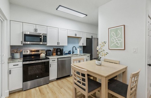 Prepare delicious meals with ease in our fully equipped kitchen, featuring modern appliances including a refrigerator, gas stove, dishwasher, microwave oven, toaster, and a Keurig coffee maker. Basic cooking necessities and dining essentials are also provided for your convenience.
